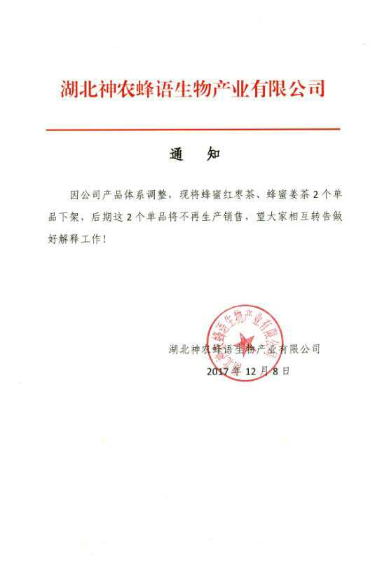 因公司产品体系调整,现将蜂蜜红枣茶、蜂蜜姜茶2个单品下架,后期这2个单品将不再生产销售,希望广大用户相互转告。以下为文件扫描件。